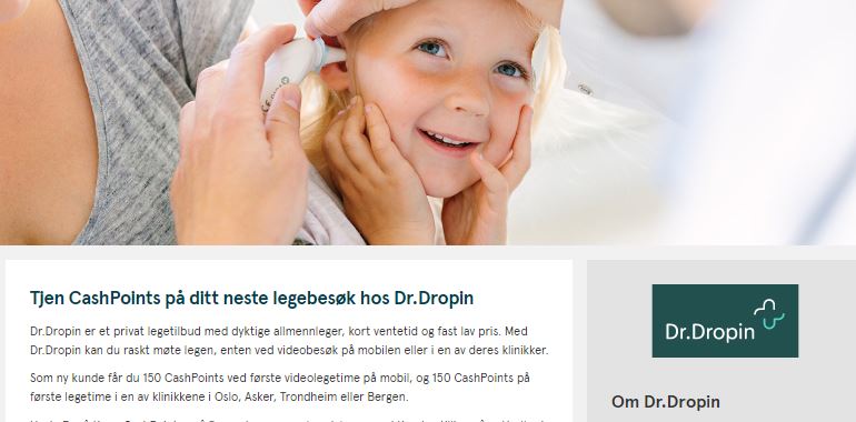 En konsultasjon hos Dr.Dropin kan foregå slik: «Vær så god, her er resepten din – og 150 CashPoints hos Norwegian på kjøpet. Kjøper du flere helsetjenester hos oss, opptjener du enda flere CashPoints.» Til opplysning tilsvarer 1 CashPoint 1 krone. Hører du at noe skurrer? Når pasientbehandling består i å skrive ut rabattkuponger til flybilletter, og når pasienter opptjener digital valuta hos legen?