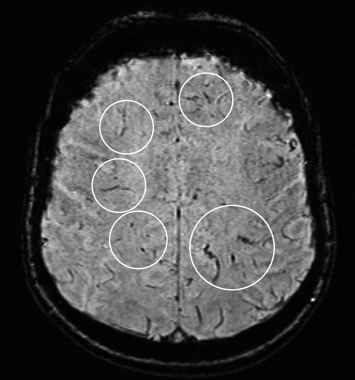 På MR-bildet sees mikroblødninger langs penetrerende kar i hjernen, tolket som cerebral sarkoid mikroangiopati. Susceptibilitetsvektede MR-bilder (susceptibility weighted imaging , SWI) er spesielt følsomme for blodprodukter.