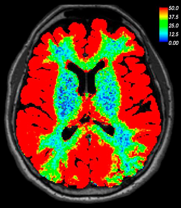 Dette MR-bildet av hjernen er tatt av en pasient 24 timer etter lumbalt innstikk og intratekal injeksjon av et MR-kontrastmiddel (0,5 ml gadobutrol). Pasienten var under utredning ved nevrokirurgisk avdeling på grunn av mistanke om kranial lekkasje av cerebrospinalvæske. Lekkasje kunne ikke påvises verken på bildet tatt etter 24 timer eller på tidligere tidspunkter. På dette bildet, som er basert på T1-vektet MR, har vi visualisert på en fargaskala den prosentmessige signaløkningen i hjernevevet som følger av kontrastanrikning. Bildet viser at et lite og vannløselig molekyl som gadobutrol kan anrike hele hjernen når det gis i spinalvæsken. Det har hittil vært uvisst i hvilken grad intratekalt injiserte legemidler kan anrike hjernevevet hos mennesker. Gitt at kontrastmiddelet ikke kan lekke inn i blodet gjennom den intakte blod–hjerne-barrieren, kan vi her slå fast at all anrikning av hjernen finner sted på utsiden av blodårene.