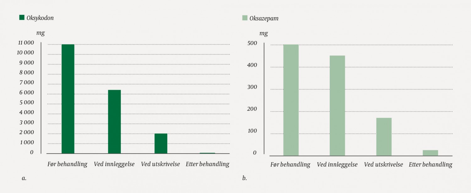 Pasienten ble deretter innlagt ved rusbehandlingsinstitusjon. Ved innkomst hadde hun en døgndose på 4 920 mg OxyContin og 1 480 mg OxyNorm. I tillegg inntok hun ca. 450 mg oksazepam per døgn. Ved innleggelse fortalte hun at hun hadde fått både psykiske og fysiske plager knyttet til det svært høye forbruket. Hun følte seg trøtt, var obstipert og hadde en uttalt følelse av uro. I tillegg hadde hun utviklet betydelige ødemer bilateralt i underekstremitetene, noe hun selv relaterte til oksykodoninntaket. Pasienten hadde hittil stort sett vært i jobb, men hadde etter hvert fungert dårlig både på jobb og sosialt. Hennes ektemann fortalte at hun ofte sovnet på ettermiddagene og kveldene.
