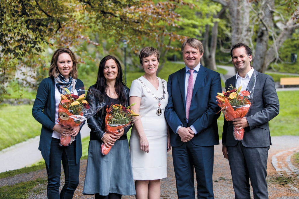 VANT I 2017: Fra venstre: Gunhild Elise Kolberg Dalen (VAP), Marianne S. Kvamsdahl (VAP), president i Legeforeningen Marit Hermansen, tidligere visepresident i Legeforeningen, Jon Helle, Nicolas Øyane (SKIL). Foto: Thomas B. Eckhoff/Legeforeningen