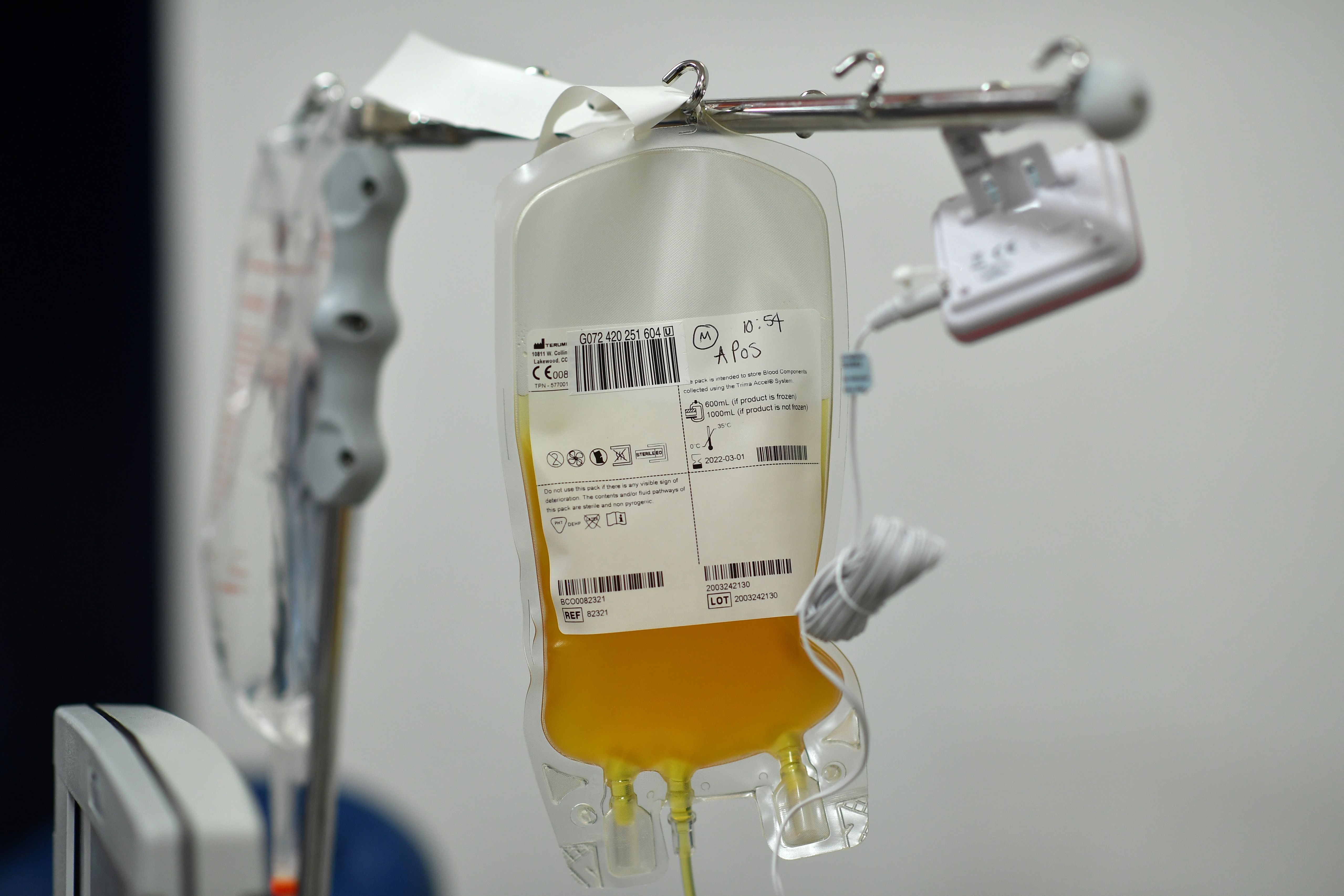 Nasofarynksprøve for sars-CoV-2 var fortsatt positiv dag 23. Pasienten var etter lang tids intensivbehandling svært preget, med betydelig muskelsvinn og vedvarende respirasjonssvikt. Om pasienten ville overleve den aktuelle sykdommen, var usikkert. Behandling med rekonvalesensplasma ble derfor diskutert med blodbanken. Det var på dette tidspunktet kommet oppfordring fra helsemyndighetene i EU om å bruke rekonvalesensplasma. Det ble fremskaffet plasma fra to blodgivere, og pasienten fikk transfusjon med rekonvalesensplasma dag 31. Begge blodgiverne hadde gjennomgått verifisert covid-19-infeksjon, og den ene hadde i tillegg fått påvist IgG-antistoff mot sars-CoV-2 i høyt nivå. Til sammen 900 ml rekonvalesensplasma ble derfor transfundert, med langsom infusjonshastighet.