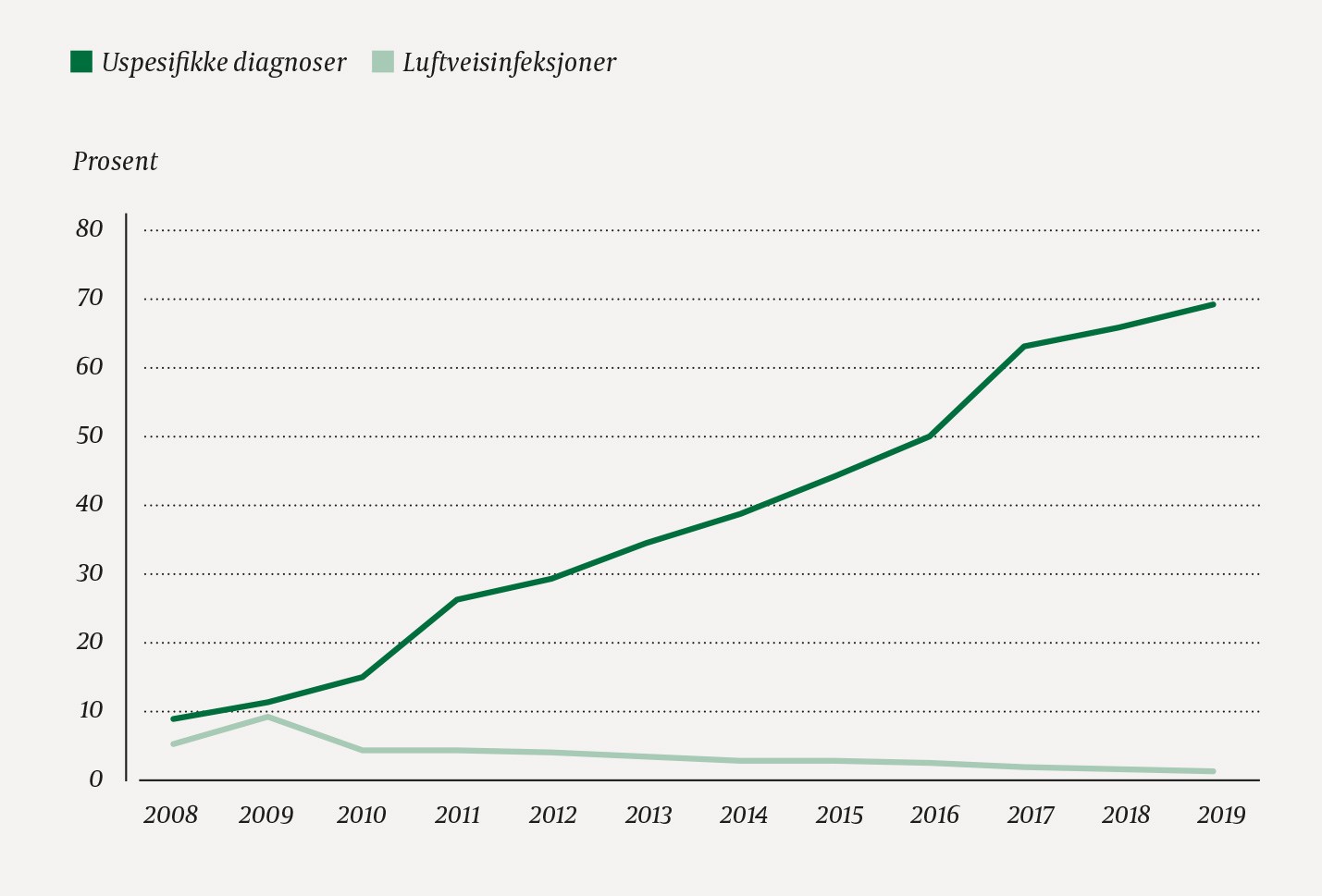 Nasjonalt kompetansesenter for legevaktmedisin har i mange år utarbeidet statistikk basert på regningskortene fra legevakt (3). Vi er etter hvert blitt bekymret over en tiltakende bruk av uspesifikke diagnoser, særlig ved telefonkontakter. I 2018 fikk 65,6 % av alle telefonkontaktene en av tre slike diagnosekoder: A29 (Generelle symptomer/plager), A97 (Administrativ kontakt/undersøkelse) eller A99 (Helseproblem/sykdom) (3). Bruk av uspesifikke diagnoser svekker muligheten for å bruke slike data til sykdomsovervåkning. Hensikten med denne studien var å analysere trenden i bruk av diagnosekoder for luftveisinfeksjoner og uspesifikke diagnosekoder i perioden 2008–19.
