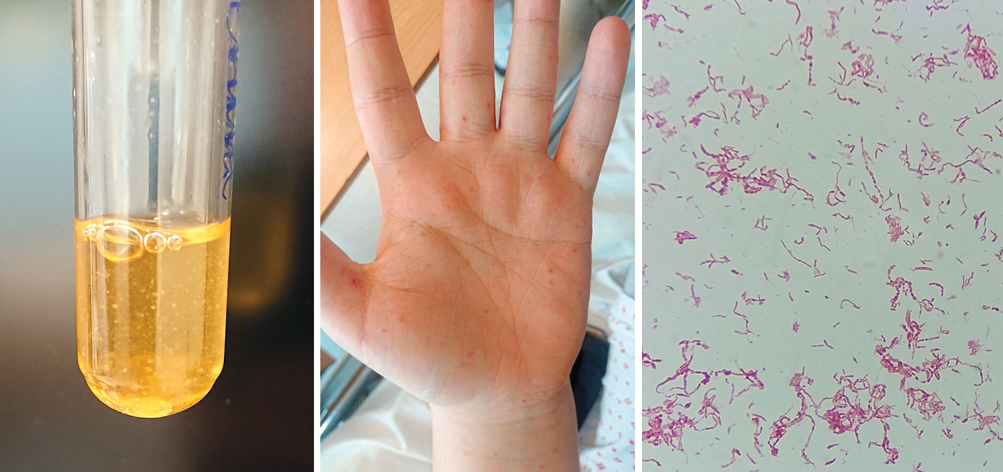 Streptobasillose gir et sykdomsbilde som kan være preget av feber, hodepine, kvalme/brekninger, muskel- og leddsmerter samt utslett, også i håndflater (7, 8).