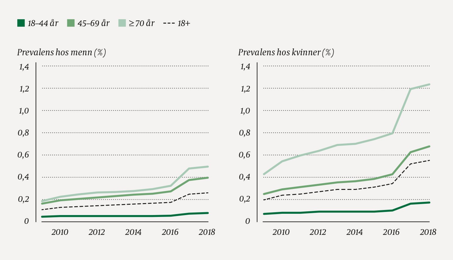 Det var en gradvis økning frem til 2016, men særlig i 2017 var økningen markant (figur 1). I 2018 var den årlige økningen igjen nesten på samme nivå som før 2016. I 2018 fikk 0,55 % av alle kvinner i befolkningen over 18 år opioider på blå resept for langvarig sterke smerter, mens tilsvarende andel for menn var 0,27 %. Disse kjønnsforskjellene ble påvist i alle aldersgrupper. I 2018 var andelen brukere av opioider for kvinner henholdsvis 0,18 % i alderen 18–44 år, 0,68 % i alderen 45–69 år og 1,24 % i alderen 70+ år. Opioidene med flest brukere på blå resept (-71) i 2018 var i rekkefølge: buprenorfin, tramadol og oksykodon. I 2009 var rekkefølgen: buprenorfin, oksykodon og tramadol.