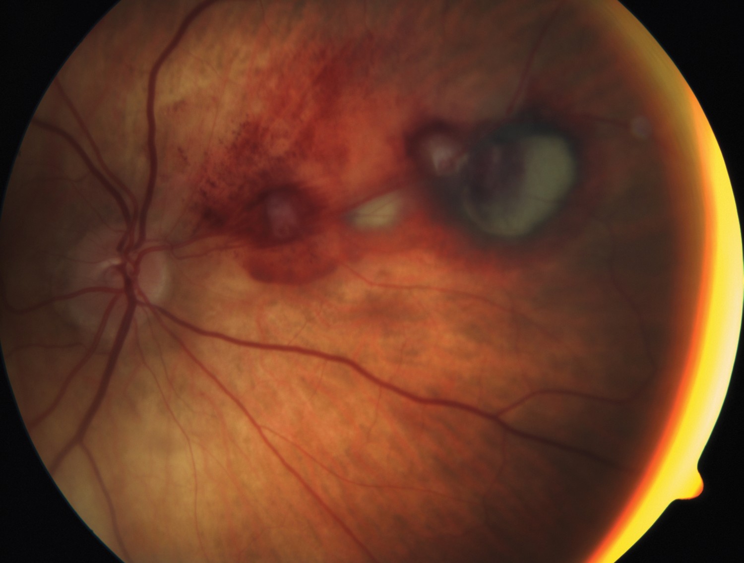 En kvinne i 80-årene hadde utviklet akutt skygge for høyre øye som hun beskrev som en «mørk ball». Hun var tidligere kataraktoperert med laserbehandling for etterstær og hadde aldersbetinget makuladegenerasjon. Hun brukte warfarin etter et hjerneslag med synsfeltdefekter som sekvele. Etter noen uker kom hun til oftalmoskopi og fluoresceinangiografi av retina. Korrigert visus var 0,5 på det aktuelle øyet. Siden lesjonene ikke påvirket makula, ble pasienten observert, og ved siste kontroll hadde hun visus 0,5 og arrforandringer nasalt for papillen.