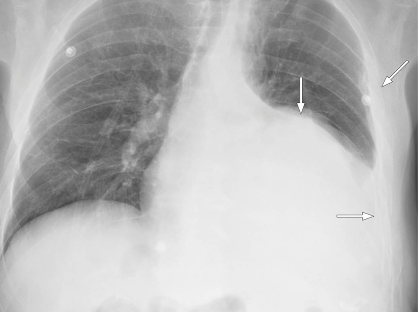 I denne kasuistikken ga behandlingen vesentlig forverring av pasientens tilstand før den tilgrunnliggende årsaken ble identifisert og korrigert. Fibrinolysebehandling ble foretrukket på grunn av tiden siden traumet og pasientens klinisk stabile tilstand og betydelige komorbiditet, herunder diabetes og pankreatitt. Ved gjennomgang av CT-bildene fra den første innleggelsen og de senere røntgenbildene ses ikke tegn til diafragmaruptur. Diagnosen er sjelden og kan være klinisk og radiologisk vanskelig å stille, men bør overveies hos pasienter med relevant høyenergitraume (3).