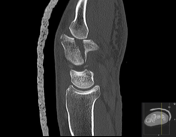 Bildet viser en langsgående fraktur i corpus av os hamatum med subluksasjon av femte karpometakarpalledd hos en mann i 40-årene etter et fall.