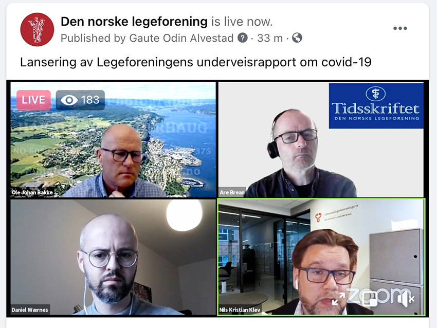 WEBINAR: Underveisrapporten ble lansert under et webinar onsdag 7. april. Øverst fra venstre: Ole Johan Bakke (sentralstyremedlem i Legeforeningen), Are Brean (ordstyrer), Daniel Wærnes (ordstyrer) og Nils Kristian Klev (leder i Allmennlegeforeningen). Skjermdump: Facebook/Legeforeningen.