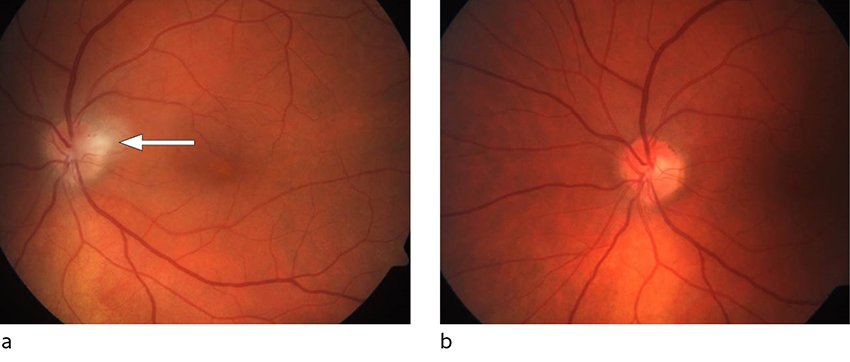 Ved øyeundersøkelse var høyre øye normalt. På det venstre øyet var beste korrigerte visus 0,75. Pasienten hadde ikke subjektiv fargesynsnedsettelse. Det ble ikke beskrevet afferent pupilledefekt. Øyets fremre segment var normalt. Det forelå noen celler i glasslegemet (vitritt) som ga litt sløret innsyn til bakre segment. Papillen var ødematøs, med et temporalt, ullent infiltrat (figur 1a).