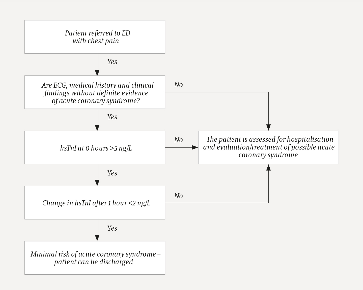 I henhold til 0 t/1 t-algoritmen (4) (figur 1) ble første prøve av høysensitiv troponin I tatt umiddelbart etter innkomst av pasienter med brystsmerter som kunne skyldes akutt koronarsyndrom. Etter en time ble det tatt ny høysensitiv troponin I-prøve. Dersom første prøve var <5 ng/L, og prøven etter en time viste endring <2 ng/L, ble pasienten utskrevet fra akuttmottaket, forutsatt at anamnese, klinisk vurdering, EKG, blodprøver og røntgen thorax (ved begrunnet indikasjon) ikke tilsa noe annet. Vi implementerte en lett modifisert versjon av European Society of Cardiology sine retningslinjer (4) ved å alltid ta to høysensitiv troponin I-prøver uavhengig av verdien på første prøve. Den europeiske algoritmen anbefalte direkte utskrivelse om første prøve var svært lav (spesifisert til <2 ng/L for det aktuelle assayet). Vår implementering av 0 t/1 t-algoritmen krevde klinisk evaluering før utskriving ved normale prøvesvar sammenlignet med den europeiske retningslinjen (4).