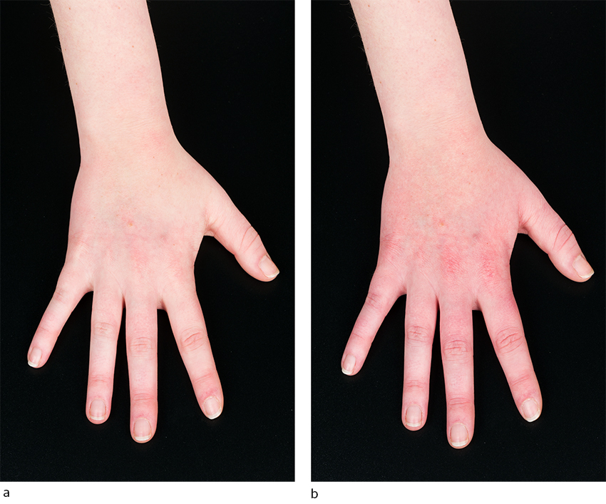 Dermografismetest med trespatel på ryggen ga umiddelbart rødhet, som var til stede etter 20 minutter. Pasienten opplevde ingen plager ved denne testen. Testing med bruk av forskjellige hansketyper viste ingen subjektive plager da hun hadde hanskene på, men erytem på håndryggen når hun tok hanskene av (figur 1). Pasienten beskrev svie på områdene med erytem. Ved testing med trang og rommelig hanske var plagene mildere og forsvant raskere ved bruk av den rommelige hansken (se video).