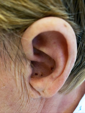 Initialt var det ingen hud- eller slimhinneforandringer, men en uke etter symptomdebut tilkom små vesikler i dypet av venstre øremusling (figur 1) og noen få vesikler i ganen på venstre side. Pasienten hadde funn forenlig med herpes zoster oticus med affeksjon av hjernenerve VII og VIII. Antiviral behandling per os med valaciklovir 1 000 mg × 3 i syv dager i kombinasjon med oral prednisolon 1 mg /kg i fem dager (2, 3) ble igangsatt. I tillegg startet man med øyebeskyttende tiltak i form av kunstig tårevæske og tildekking (2).