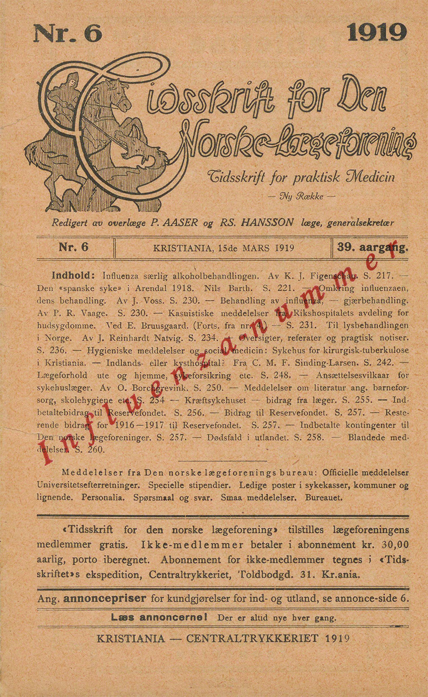 Som et uveir kom influenzaen over os siste sommer. (…) Efterhvert som ængstelsen blant befolkningen tiltok, blev forslagene i dagspressen til forebyggelse og behandling mere og mere talrike og indtrængende. Det var særlig diskussionen om værdien av alkohol som profylaktikum og terapeutikum, som optok interessen og litt efter litt tilspidset sig med fanatiske og lidenskabelige indlæg for og imot. – Nu, da stormen for denne gang er over og jeg efter de vundne erfaringer stiller mig det spørsmaal: Har vi i alkohol eller andre medikationer et virksomt profylaktikum likeoverfor influenza, som vi kan peke paa og anbefale til saadant bruk, naar den næste epidemi engang maatte komme? –, maa svaret fra min erfaring desværre bli et avgjort: nei! Det positive, jeg mener vi har lært, er, at sygdommen efterlater immunitet hos de fleste mennesker; men vi har ogsaa lært det negative, at vi hittil ikke kjender et eneste paalidelig profylaktikum mot influenza.