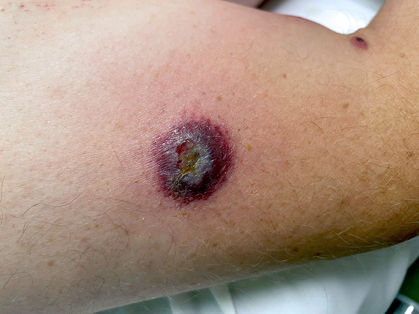 Hudlesjonene hadde noe heterogent utseende og størrelse, men flere hadde en sentral oppfylling med mer inflammert aktiv randsone. Bildet viser et større element fra lateral side av høyre overekstremitet, som ble biopsert. Ytterligere utredning verifiserte diagnosen akutt myelogen leukemi med undergruppe akutt monoblastleukemi. Grunnet hyperleukocytose ble det oppfattet som kritisk å raskt initiere kjemoterapibehandling. Denne ble startet dagen etter innkomst. Etter få dager falt leukocyttallet betydelig, samtidig som hudforandringene raskt gikk i regress. Svar på hudbiopsien verifiserte tilstedeværelse av leukemiske blastceller i alle lag i dermis, forenlig med leukemisk infiltrasjon i hud.