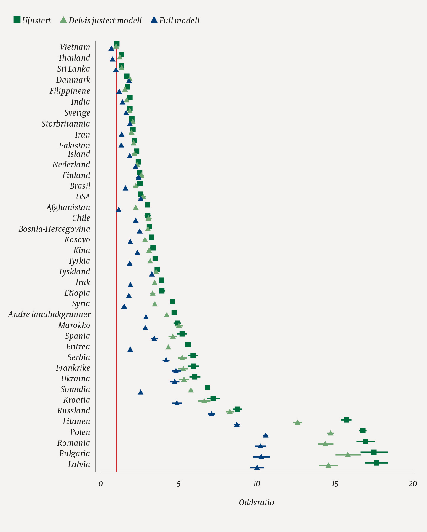 Figur 1 viser estimerte oddsratioer etter landbakgrunn. Fullt sett av estimerte oddsratioer med standardfeil er presentert i appendiks 2b. Det var stor variasjon i oddsratio mellom landbakgrunnene i både den ujusterte og de justerte modellene. De landbakgrunnene med høyest ujustert oddsratio, Latvia (OR = 17,7; 95 % KI 17,0 til 18,4), Bulgaria (OR = 17,5; 95 % KI 16,6 til 18,4), Romania (OR = 17,0; 95 % KI 16,3 til 17,6), Polen (OR = 16,8; 95 % KI 16,6 til 17) og Litauen (OR = 15,7; 95 % KI 15,4 til 16,0), hadde 15–18 ganger så høye odds for å være uvaksinert som de med norsk landbakgrunn. Personer med landbakgrunn fra Vietnam hadde den laveste oddsratioen med 1,0 (95 % KI 1,0 til 1,1) i den ujusterte modellen og hadde dermed omtrent like odds for å ha tatt vaksine som personer med landbakgrunn fra Norge. Når vi justerte for alder, kjønn, risikogruppe og tidligere fylke var det ingen stor endring fra den ujusterte modellen i noen av landgruppene, men oddsratioen ble noe redusert for de fleste.
