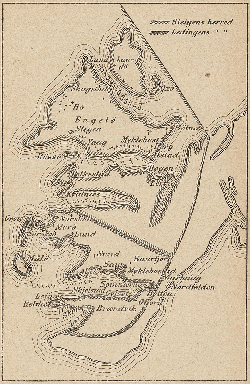 Distriktet omfatter Steigens – 2416 indb. – og Ledigens – 1255 indb. – herreder. For Ledingens vedkommende er de store trafikcentrer kirkestedet Leinæs og handelsstedet Grøtø – det første om hverdagene, det sidste de søndage, der er gudstjeneste. Hvad åstederne for sygdommens optræden forøvrigt angår henvises til kartskissen, der er holdt saa schematisk som muligt.