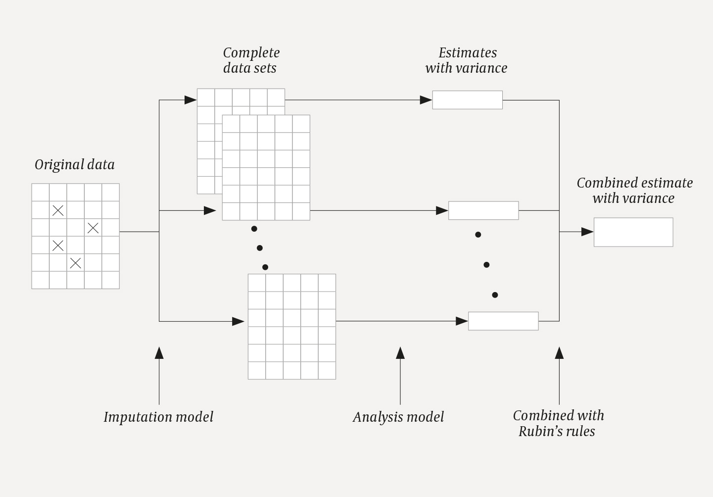 Etter imputering analyseres hvert av de komplette datasettene med analysemodellen. Hver analyse gir et estimat med tilhørende varians for størrelsen(e) vi er interessert i, f.eks. regresjonskoeffisienten for fysisk aktivitet. Til slutt kombineres estimatene og variansene ved hjelp av spesifikke regler, de såkalte Rubins regler (1) . Det kombinerte estimatet er lik gjennomsnittet av alle estimatene. Den kombinerte variansen er lik gjennomsnittet av variansene, pluss et ledd som tar hensyn til variasjon mellom de imputerte datasettene. Deretter kan man beregne konfidensintervall og p -verdi. Fremgangsmåten er illustrert i figur 1. Mange størrelser kan kombineres med Rubins regler, blant annet gjennomsnitt, standardavvik, andel og regresjonskoeffisient. Oddsratio og hasardratio bør logaritmetransformeres før de kombineres.