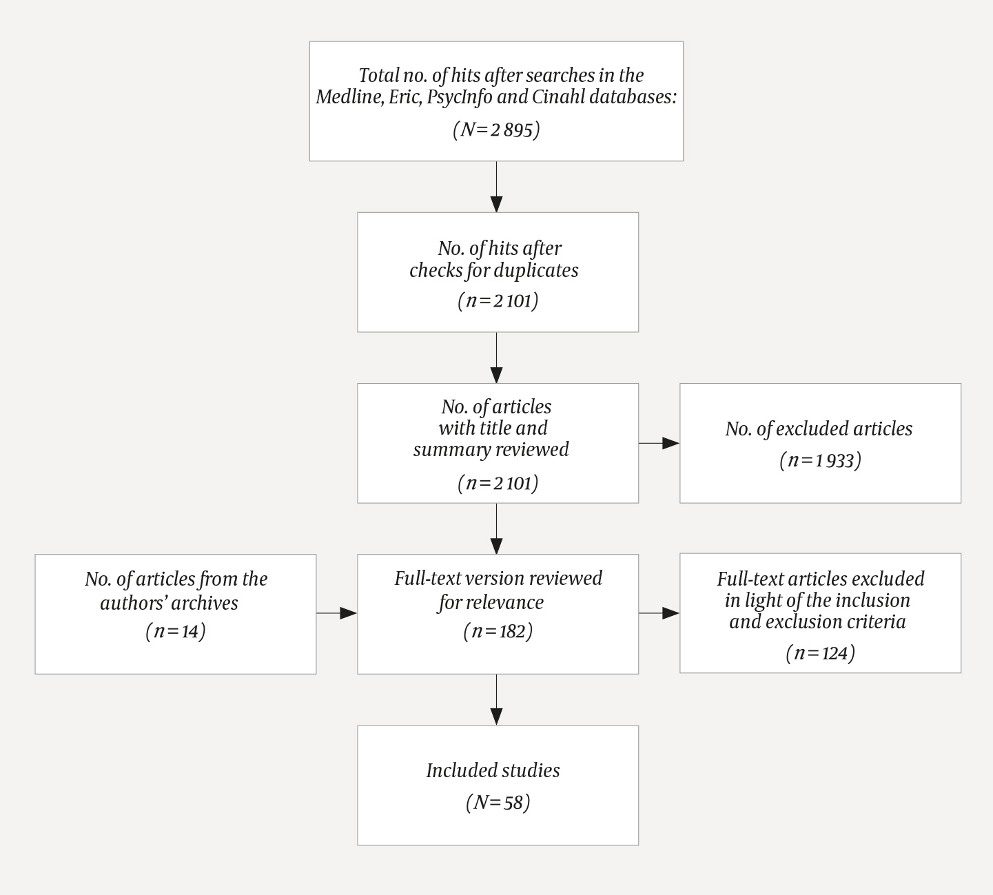 Søket ble avsluttet 3. juni 2020 og var avgrenset til artikler på engelsk eller skandinaviske språk publisert i fagfellevurderte tidsskrift. Vi fikk 2 101 treff etter duplikatfjerning. Artiklenes relevans ble først vurdert på bakgrunn av tittel og sammendrag. Rayyan, et elektronisk verktøy som gjør at to eller flere personer kan gjennomgå referanser blindet og uavhengig av hverandre etter bestemte inkluderings- og ekskluderingskriterier, ble benyttet i utvelgelsen. Tre av oss (BA, MG og AF) deltok i den fasen. Vi startet med en blindet vurdering av de samme 50 artiklene for å kalibrere en felles vurderingsmåte. Resterende artikler ble fordelt likt for utvelgelse. Vi inkluderte også 14 artikler fra eget litteraturarkiv. De 182 artiklene som ble valgt ut, ble gjennomlest i fulltekst av alle forfattere, og 58 ble inkludert. Vi inkluderte alle artikler som oppfylte følgende kriterier: utdanningstiltak(ene) var tydelig beskrevet, studiepopulasjonen var uteksaminert fra grunnutdanning i medisin, og utfallsmål omfattet arbeidssted (distrikt/ikke-distrikt) etter endt grunnutdanning.
