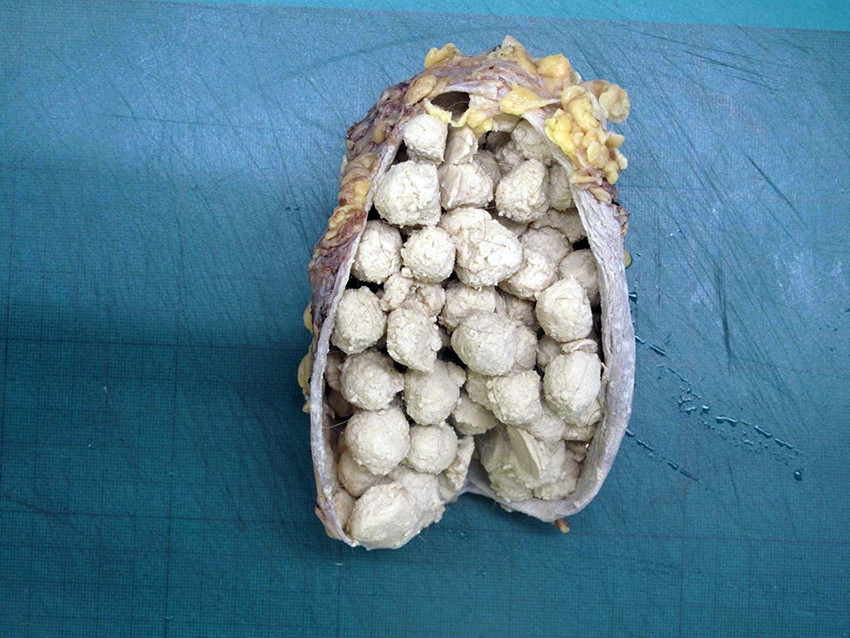Bildet viser en unilokulær cyste med en glatt og jevn innside som inneholder rikelig med kuleformede talg- og hårelementer (bilde 1). Den ble fjernet in toto og helt uten ruptur. Sagittalt CT-bilde av bekken tatt preoperativt viser en stor, unilokulær cystisk oppfylning i venstre fossa ischiorectalis, som gir lett kranial forskyvning av musculus levator ani (bilde 2). Lesjonen ble målt til 16,3 × 9,8 × 8,8 cm. Histologisk undersøkelse postoperativt avdekket en cyste kledd av plateepitel med underliggende hårsekker med arrector pili-muskler samt talg- og svettekjertler (bilde 3).