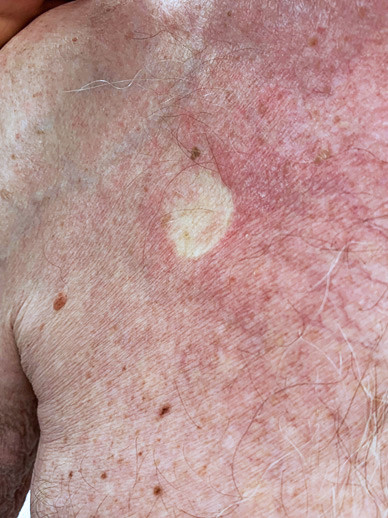 Bildet viser forsinket kapillærfylling etter fem sekunder ved trykk mot huden på brystet hos en mann i 80-årene. Pasienten var henvist til beinmargsbiopsi på bakgrunn av CT-funn av forstørrede lymfeknuter supraklavikulært og monoklonal komponent av type IgM-kappa påvist ved serumproteinelektroforese. IgM ble målt til 35,3 g/L (referanseområde 0,3–2,3). Beinmargsbiopsi viste infiltrasjon av lymfoplasmacytoide B-celler, og ved samtidig monoklonal komponent av type IgM var disse funnene diagnostisk for Waldenströms makroglobulinemi.