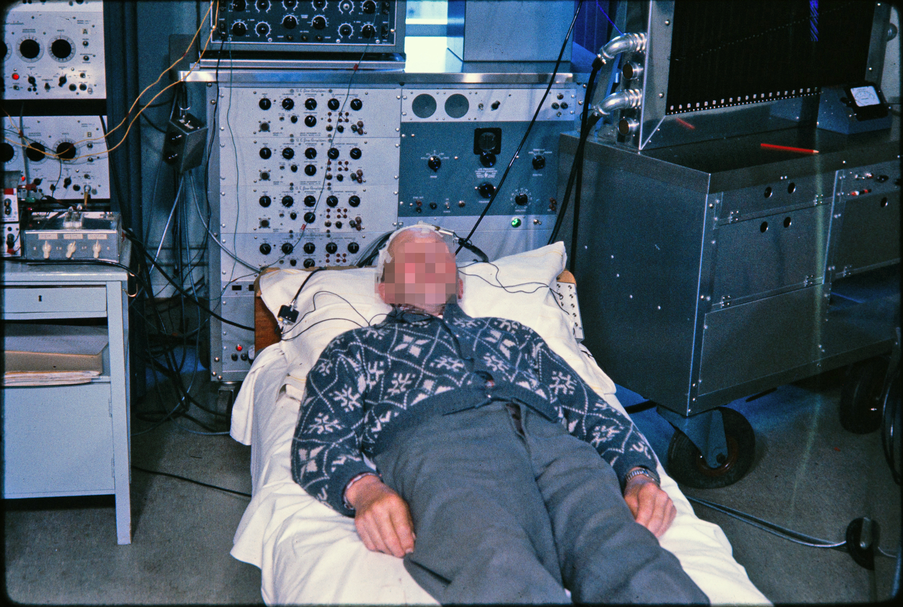 Bildet er tatt på EEG-laboratoriet på Gaustad sykehus i Oslo på 1950-tallet og viser en av de aller første pasientene i verden der dyp hjernestimulering er brukt mot Parkinsons sykdom. Den supplerende videofilen viser effekten av stimulering hos to pasienter. Merk hvordan skjelvingen stopper så lenge stimuleringen pågår (rødt og grønt lys tennes på instrumentpanelet), forbigående ved kortvarig stimulering hos den første pasienten og vedvarende ved langtidsstimulering hos den andre.