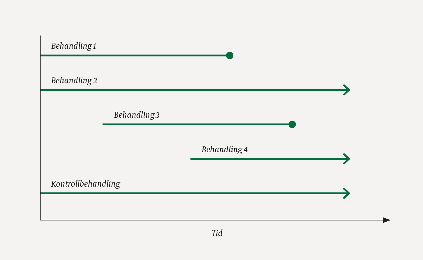 En skisse av en enkel plattformstudie er vist i figur 1. I virkeligheten kan bildet være mye mer komplekst, for eksempel hvis kontrollbehandlingen endres underveis eller nye pasientgrupper blir inkludert. En plattformstudie som har pågått over lang tid, er I-SPY 2, som inkluderer forskjellige typer neoadjuvant behandling ved lokalavansert brystkreft (4) .