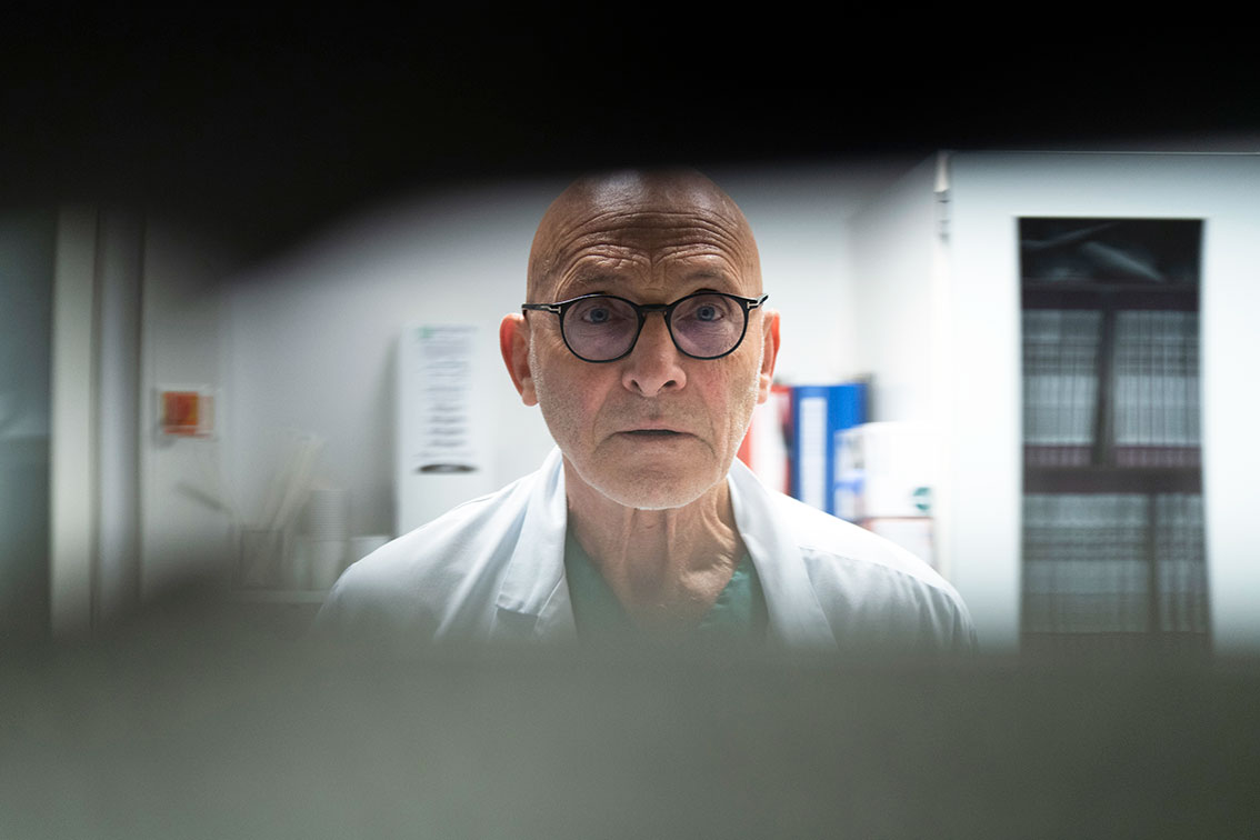 Han retter litt på de mørke brillene. Under frakken lyser en operasjonsstuegrønn kittel opp.