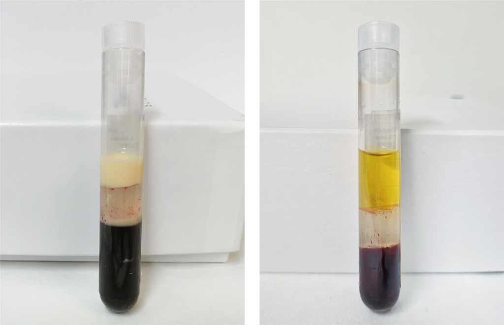 Blodprøven til venstre er fra en pasient med svært forhøyet nivå av triglyserider på 31,1 mmol/L (referanseområde 0,45–2,60). Pasientens serum (det øverste sjiktet i prøven) fremstår derfor som blakket sammenlignet med normalt strågult og semitransparent serum som vist i prøven til høyre fra en frisk laboratorieansatt (midtre sjikt i prøvene er separasjonsgel). Pasienten, en mann i 40-årene, var innlagt med akutt nekrotiserende pankreatitt med behov for respirasjonsstøtte i intensivpost. Grunnet ekstrem hypertriglyseridemi ble det vurdert indikasjon for plasmaferese (maskinell utbytting av plasma) i tillegg til standard konservativ behandling. Han fremviste god bedring og kunne skrives ut i velbefinnende tre uker senere. Etter utskrivning har pasienten blitt fulgt opp poliklinisk med livsstilsintervensjon og medikamentell behandling med rosuvastatin og omega-3-syreetylestere. Oppfølgingsprøver har vist stabile triglyserider på rundt 3–6 mmol/L, og pasienten er tilbake i full jobb.