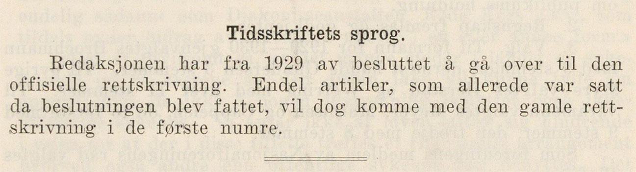 Den i «Tidsskriftet»s første nummer for iår bebudede forandring i «Tidsskriftet»s sprog er nu kommet i andet hefte. – Da jeg skulde til med dette nummer, husket jeg ikke på dette glædelige budskap – og begyndte trøstig på første artikel. Men det var ikke mange linjer jeg var kommet, før den nye sprogdrakt virket således på mig, at artiklens faglige indhold blev mig aldeles fordærvet, jeg måtte simpelt hen – for denne gang ialfald – gi op. Istedenfor gav jeg mig – nolens volens – til blot at se igjennem artiklen fra dens orthografiske side – NB. ikke dens sproglige. For det er vel ikke sprogets, men den såk. retskrivnings forandring redaktionens glade budskap går ut på – altså for så vidt et galt valgt uttryk for meddelelsen – heldigvis! Det skulde bare manglet at det virkelig var sproget: Nu går vi over til landsmål! Forresten, man vet sig jo aldrig tryg for hvad man kan risikere – men den dag melder ialfald jeg mig ut av Lægeforeningen resp. «Tidsskriftet» – hvis jeg da ikke forinden er død.