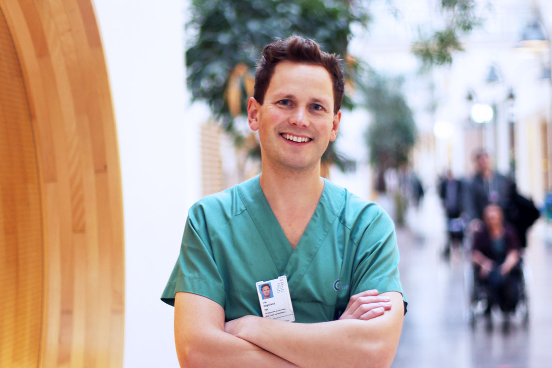 Erik Helgeland er lege i spesialisering ved Thoraxkirurgisk avdeling på Rikshospitalet. Dagens første operasjon på en pasient med lungekreft krever en teknisk mer avansert metode enn vanlig.