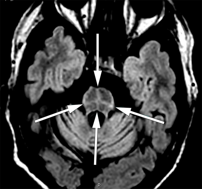 Transversalt MR-bilde med FLAIR-sekvens viser, i tillegg til generell cerebellar atrofi, et korsformet hyperintenst signal i pons, såkalt korsbolletegn (på engelsk: hot cross bun sign ).