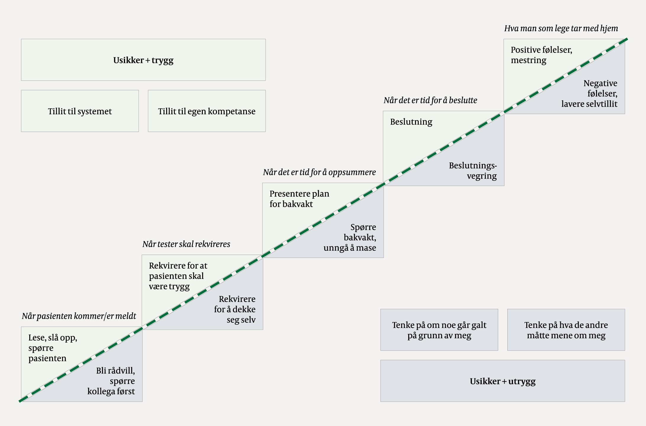 Figur 1 visualiserer sentrale elementer i vår analyse som avhenger av om LIS1-legene opplevde trygghet eller utrygghet mens de var usikre, både generelt (rektangler) og i prosessen hvor de hadde ansvaret for en pasient (trekanter). I midten av figuren, skrått fra bunn til topp, går en stiplet linje, som uttrykk for at den er permeabel og at LIS1-leger fra situasjon til situasjon kunne bevege seg over eller under den stiplede linjen.