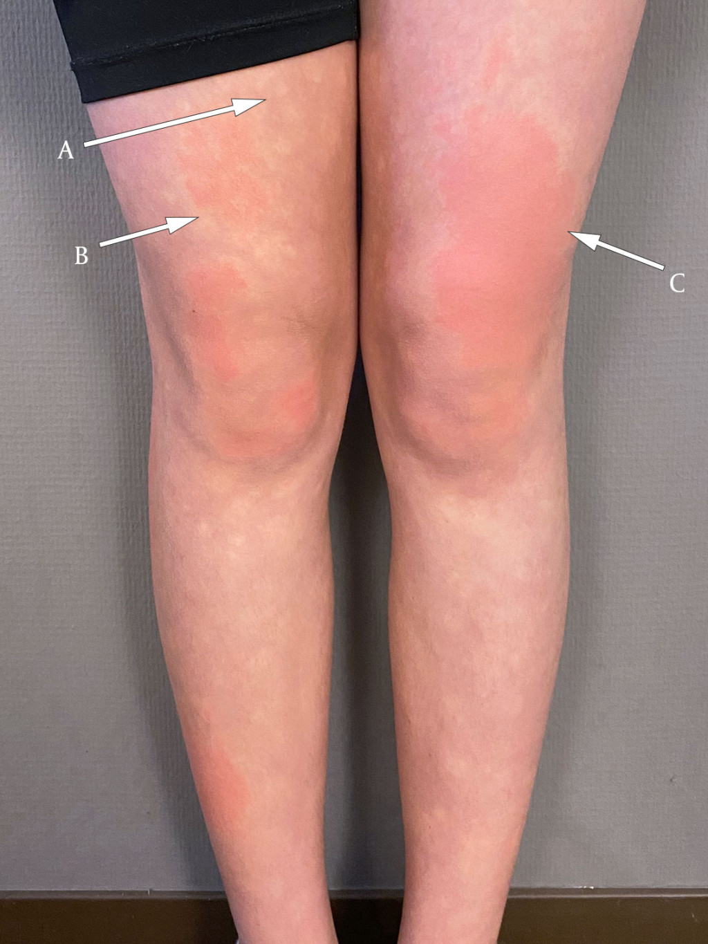 Fotografiet viser et stillingsavhengig utslett på underekstremitetene bestående av fysiologisk anemiske makler (pil A) (betegnet som Biers anemiske makler), erytrocyanose (pil B) og urtikarialignende lesjoner (pil C). Tilstanden, som er blitt kalt BASCULE-syndrom (Bier anemic spots, cyanosis and urticaria-like eruptions), er en godartet vasomotorisk hudsykdom.