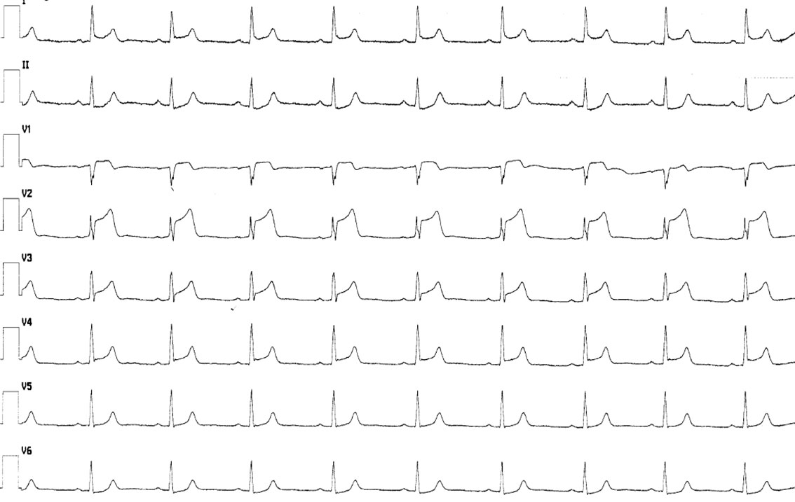 På fjerde innleggelsesdag fikk pasienten en ny episode med brystsmerter i hvile, denne gangen ledsaget av ST-elevasjoner i avledning I og V1–V4 i EKG (figur 1). Kontroll-EKG etter ett minutt viste komplett tilbakegang av ST-T-forandringene (figur 2), og pasienten var da smertefri. I to minutter vekslet hjerterytmen mellom sinusrytme og ikke-vedvarende ventrikkeltakykardi med frekvens på 170 slag per minutt. Koronar spasme ble nå mistenkt, og det ble startet opp behandling med kalsiumantagonist i form av amlodipin (tabletter, 10 mg × 1).