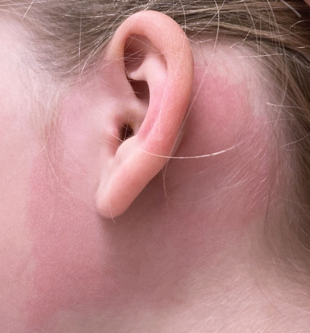 Eit par dagar før innlegginga oppstod først eit erytem rundt venstre auge (figur 1). Dette var ujamt avgrensa, makulært og relativt diskré, og conjunctiva på venstre auge var med blandingsinjeksjon. Fire dagar etter det periorbitale erytemet kom eit nytt erytem, rundt venstre øyre. Dette var klart avgrensa, makulært og involverte ein sparsam, raudleg hevelse på øyremuslingen (figur 2). Begge erytema var lokaliserte på kontralateral side av det observerte flåttbitet.