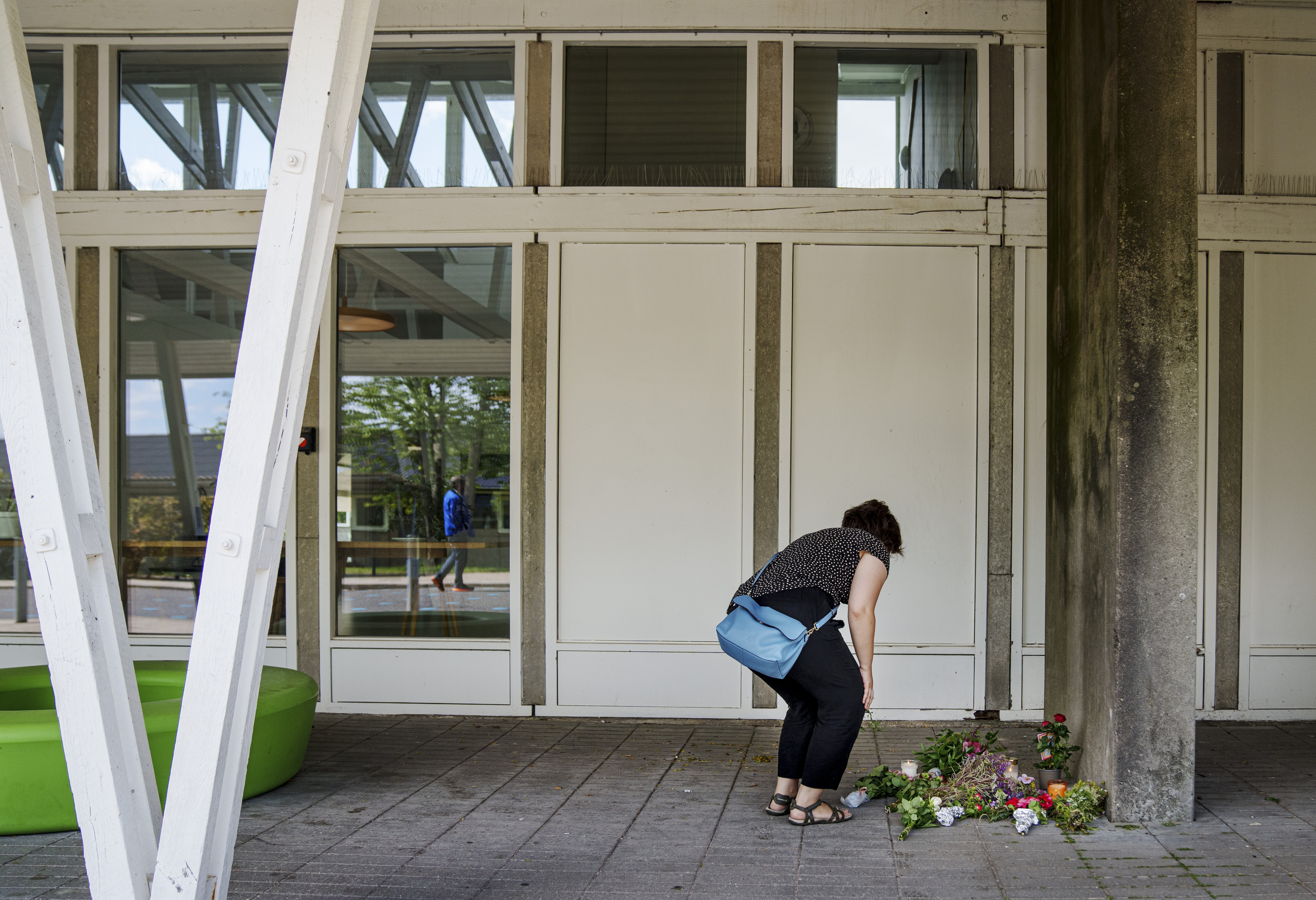 En dame legger ned blomster utenfor Psykiatrisk Center Glostrup i Danmark etter hendelsen i juli 2023 der tre ansatte ble knivstukket av en pasient. Overlege Mariann Stenberg ble drept. Foto: Ritzau Scanpix