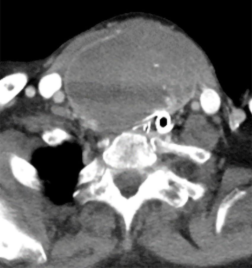 Kontrastforsterket aksialt CT-bilde av halsen viser stor oppfylling i relasjon til høyre tyreoidealapp med diameter 8 cm (og 10 cm kraniokaudal utbredelse fra nivå med C4/C5 til Th2/Th3). Trakea er betydelig komprimert og dislokert posterolateralt mot venstre (pasienten er intubert). De cervikomediastinale blodkarene synes upåvirket.