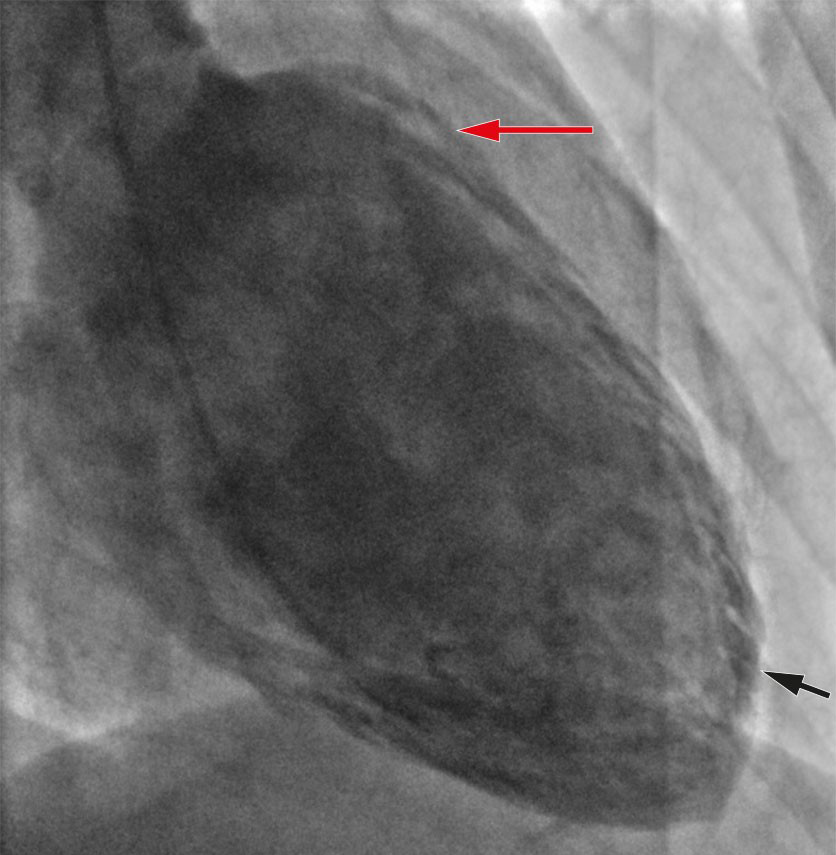 Koronarangiografi viste normale koronararterier, og ventrikulografi viste hypokinesi apikalt og hyperkontraktilitet basalt, typisk for takotsubosyndrom (Figur 2). Samme kveld ble det startet opp behandling med 1,25 mg ramipril.
