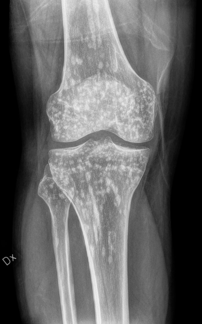 Røntgenbildet viser multiple flekkvise sklerotiske lesjoner i både femur, tibia og fibula. Bildet ble tatt da en tidligere frisk mann i slutten av trettiårene oppsøkte ortopedisk skadepoliklinikk etter et fall med vridning av kneet. Han kunne på dette tidspunktet ikke belaste det vonde benet, og opplevde at en bøyd knestilling ga mindre ubehag. Pasienten ble henvist til akutt røntgen for å utelukke brudd. Røntgenfunnet er forenlig med osteopoikilose og tolkes som et tilfeldig funn, ikke relatert til pasientens aktuelle skade. Pasientens smertetilstand i kneet gikk over av seg selv uten aktive tiltak.