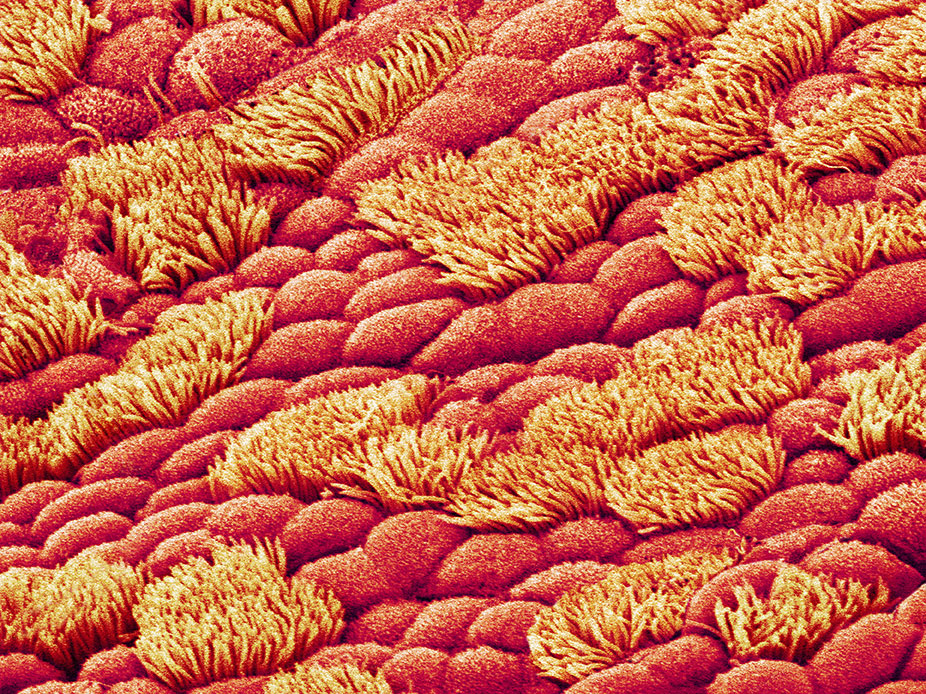 Neseslimhinne. Et farget bilde fra skanningelektronmikroskop (SEM) av flimmerhår som dekker epitelkledningen i nesehulen. Disse mikroskopiske hårlignende strukturene er dekket med et klebrig slim (ikke vist) som fanger opp støv og andre innåndede partikler. Koordinerte, bølgelignende bevegelser av flimmerhårene skyver slimet til baksiden av nesen (farynks), hvor det blir svelget. Illustrasjonsfoto: Science Photo Library / NTB