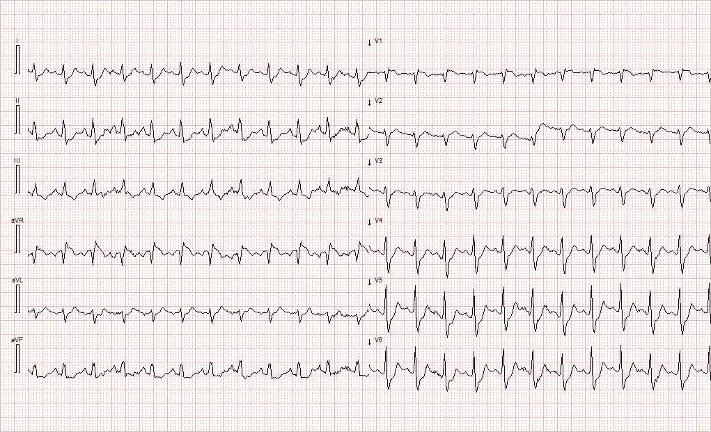 Ambulansepersonell sendte 25 minutter senere inn et nytt EKG (figur 2), som viste atrieflimmer med frekvens 120 slag/min, breddeøkt QRS-kompleks med høyre grenblokk-mønster samt T-inversjon i III og V1–V3.