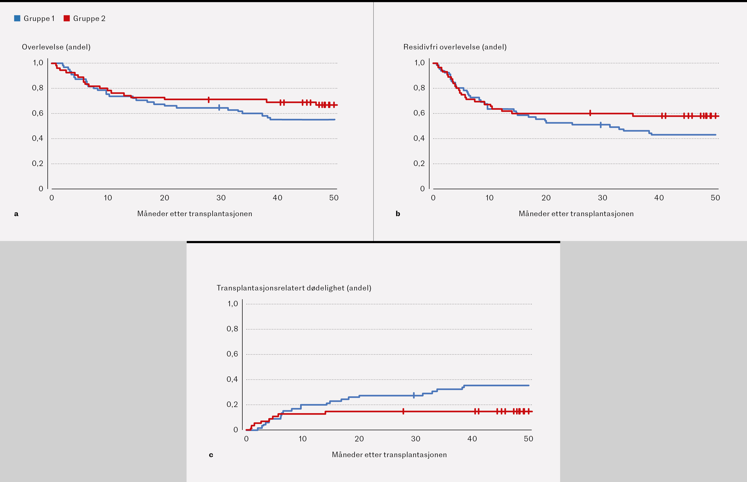 To års overlevelse var 42/65 (65 %) i gruppe 1 og 39/55 (71 %) i gruppe 2 (figur 1a). Residivfri to års overlevelse var henholdsvis 34/65 (52 %) og 33/55 (60 %) (figur 1b). Transplantasjonsrelatert dødelighet var 18/65 (28 %) i gruppe 1 og 8/55 (15 %) i gruppe 2 (figur 1c). 5/65 i gruppe 1 og 7/55 i gruppe 2 døde av residiv. De hyppigste dødsårsakene i gruppe 1 var transplantat-mot-vert-sykdom, multiorgansvikt og residiv, med 5 døde pasienter i hver av disse kategoriene. 8/23 pasienter døde av andre transplantasjonsrelaterte årsaker. I gruppe 2 døde 7/16 av residiv mens 8 pasienter døde av ulike transplantasjonsrelaterte årsaker. I ett tilfelle var dødsårsaken ukjent. Overlevelse og residivfri overlevelse for de ulike lymfomtypene er angitt i tabell 1.