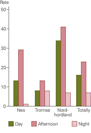 Of all requests, 64 % were recorded on weekdays and 36 % at weekends. Requests to the three clinics were fairly evenly distributed during weekdays (results not shown), but the timing of requests varied a lot. Whereas requests (per 1 000 inhabitants) made to the clinics during normal work hours was seven times higher in Nordhordland than in Tromsø, the rate at night was fairly similar. Figure 1 shows the request rate per 1 000 inhabitants at different times of the day or night all days of the week. Only 25 % of the patients in Tromsø rang before presenting at the clinic, while those in Nes (83 %) and Nordhordland (91 %) usually called before coming. Requests from the Emergency Medical Communication Centres (EMC) comprised less than 2 % in all the casualty clinics.