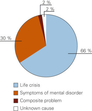 Most patients (66 %) who took contact had no mental disorder themselves, but described various life crises (fig 1). A little less than a third of patients (30 %) had symptoms of mental disorder. Within the category life crises; serious life events were the most important group and worries about others the second most frequent (tab 2). Within the category mental disorders the largest group was depression and suicide problems. Life crises were recorded for 69 % of women and 59 % of men. 27 % of women and 36 % of men presented with possible symptoms of mental disorders. Of the 48 response groups (across categories) most concerned worries about own children. The second most frequent response group was depression and suicide problems, while break-up of partnerships came third (tab 3). In the age group 1 – 18 years sexual assaults was the most frequently used response group, with 25 % of patients. Six of the single response groups were not used.