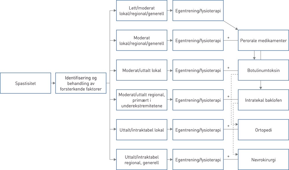 Peroral drugs can be prescribed by the primary doctor. For treatment with botulinum toxin the patient should be referred to the nearest specialist who can offer this treatment. Assessment, testing and implantation of baclofen pumps are carried out by university clinics. Observation and problem description by the patient’s primary doctor and physiotherapist and information about the patient’s other illnesses and conditions are important for enabling the correct treatment strategy to be chosen. The use of warfarin and conditions that result in a higher risk of haemorrhaging may be a relative contraindication that should be considered before botulinum toxin is used or intrathecal baclofen is tried. Refilling and other adjustment of pumps are carried out at a number of hospitals in Norway. The patient should receive an offer from the closest hospital to avoid having to travel far. All other measures should be attempted before orthopaedic or neurosurgical intervention is considered.