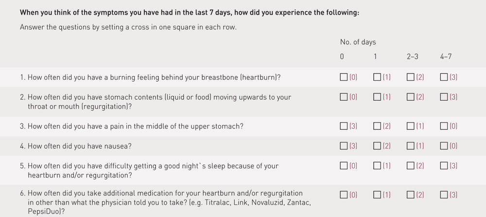 Jones R, Junghard O, Dent J et al. Development of the GerdQ, a tool for the diagnosis and management of gastro-oesophageal reflux disease in primary care. Aliment Pharmacol Ther 2009; 30: 1030 – 8.