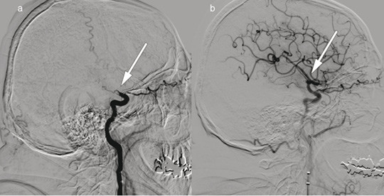 Patient 1. A man in his 70s was admitted with acute right-sided paralysis. The neurological outcome was scored on the National Institutes of Health Stroke Scale (NIHSS) to 21 points (severe cerebral infarction), and intravenous thrombolytic therapy was administered. The image to the left shows cerebral angiography with contrast injection in the left internal carotid artery, a) before and b) after embolectomy of a so-called T-occlusion (arrows) in the left carotid siphon and middle cerebral artery. The thrombus was removed and blood flow to the left hemisphere was restored 195 minutes after symptom onset. Further workup revealed atrial fibrillation and an embolic cerebral infarction in the middle cerebral artery territory. The patient received anticoagulation therapy with rivaroxaban. The NIHSS score was 0 points at follow-up three months later.