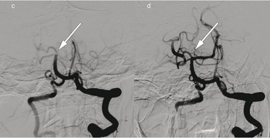 Patient 2. A woman in her 70s experienced acute onset of right-sided paralysis, dizziness and dysarthria after heart surgery. Her NIHSS score was 23 points (severe cerebral infarction). Intravenous thrombolytic therapy was contraindicated. The image to the right shows cerebral angiography with contrast injection in the left vertebral artery, c) before and d) after embolectomy of a large thrombus (arrows) with occlusion of the superior cerebellar artery, posterior cerebral artery and the bifurcation of the basilar artery. Embolectomy was performed with recanalisation 220 minutes after symptom onset. The event presumably occurred after heart surgery. Further workup also revealed atrial fibrillation. The patient received anticoagulation therapy with warfarin, and at follow-up three months later, the NIHSS score was 0 points.