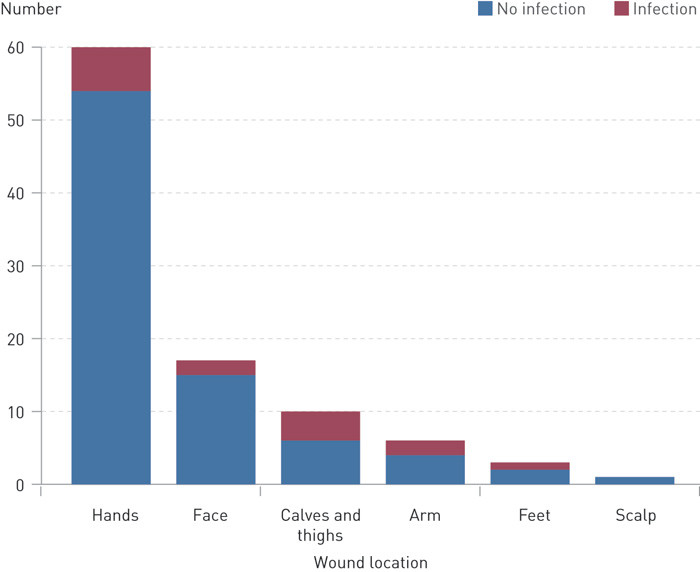 Wounds located on the hands and face were most numerous, but had the lowest percentage of infections compared with other parts of the body.